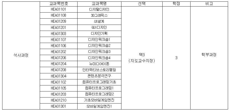 2. 선택과목 : 디지털콘텐츠디자인특론, 디지털매체연구, 디지털콘텐츠디자인세미나, 통합디지털콘텐츠디자인연구, 논문연구