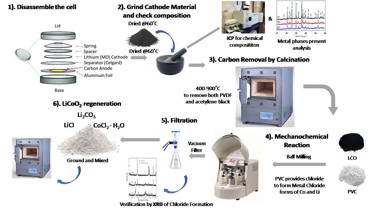 ❍ 폐스마트폰 등으로부터 회수된 폐배터리의 재사용을 위해서 전지 상태에서 충전용량(Capacity), 속도특성(Rate Capability) 및 반복충방전(Cyclic Charge-Discharge) 등의 성능평가를 실시 ❍ 다양한 온도/습도 환경에서 성능 안정성을 진단 ❍ 출고/이론 스펙과 비교를 통하여 재사용 프로토콜을 확립 ❍ 수집된 Data의 해석법 개발 ❍ 이를 효과적으로 진단할 수 있는 폐배터리 재사용 진단 시스템 개발확립된 재사용 프로토콜에 의해 재사용이 가능하지 않는 안정성 및 성능을 보이는 폐배터리를 분해하여 리튬 및 코발트 등 유가금속이 다량 포함되어 있는 양극소재를 회수 ❍ 도전제 등의 여타 성분을 제거 및 상분석 실시하며, 기계화학적 방법 등을 통해 리튬산화물계 양극소재를 합성 |