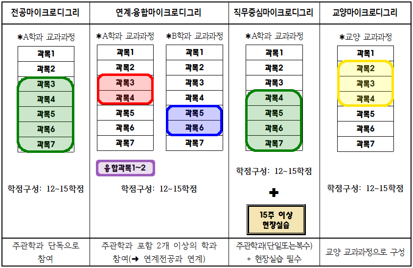 이수학점 유형명 이수학점 전공마이크로디그리 12~15학점(미래융합대학 일부과정에 한하여 9학점) 연계·융합마이크로디그리 12~15학점 직무중심마이크로디그리 12~15학점, 15주 이상의 표준현장실습학기제 추가 이수 교양마이크로디그리 9~15학점 - 모듈형 교육과정 이수 신청은 학생이 해당 교육과정으로 개설된 교과목을 수강하는 것으로 이수 신청한 것으로 봄.(유사과목, 대체과목 등은 인정하지 않음)
